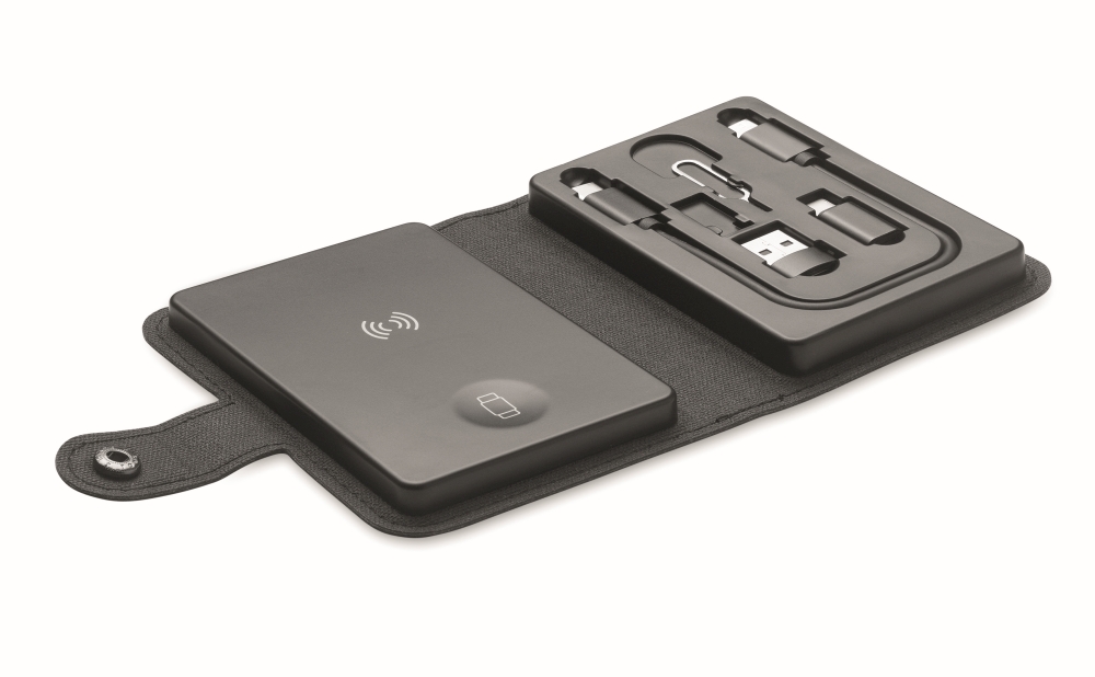 Sada kabelových konektorů, bezdrátové 15W nabíječky a nabíječky hodinek (pouze Apple®). Nabíjecí kabel 4v1 a nástroj pro vysunutí sim karty. Kryt z recyklovaného PU, plasty z recyklovaného ABS a destička z recyklovaného hliníku. Rozměry: 11 x 8,3 x 2,7 cm
