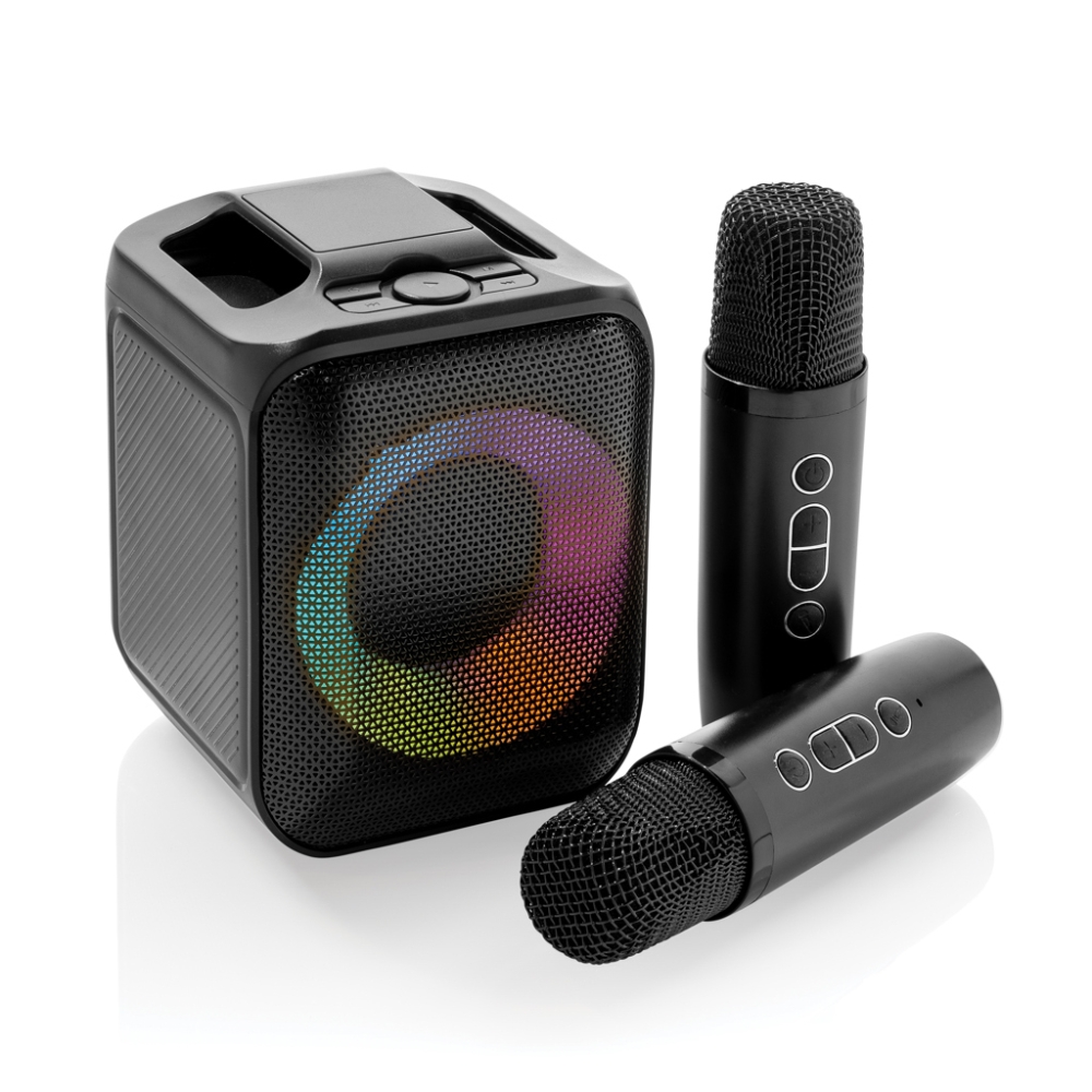 Karaoke sada se reproduktorem a dvěma mikrofony. Reproduktor a mikrofony můžete nabíjet současně. 5W reproduktor je dodáván s 2000 mAh baterií, která přináší až 6 hodin používání. Reproduktor také podporuje TF kartu a USB. Při využívání mikrofonů se můžet
