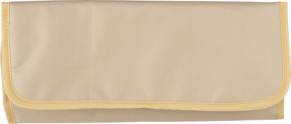 Sada na krájení sýrů z rPET v pouzdře uzavíraném na suchý zip z 600D. Tři nože z nerezové oceli s dřevěnými rukojeťmi. Uvnitř je štítek z rPET. Bezpečné pro potraviny. Jednotlivě baleno v hnědé kartonové krabici. Rozměry: 11 x 26,5 cm