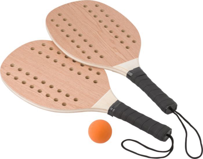 Set na plážový tenis z palisandrového dřeva. Sada se skládá ze dvou pálek a jednoho měkkého míčku. Zabaleno v bavlněném sáčku, který je z jedné strany ze síťoviny a z druhé je pevný. Rozměry: 47.2 x 22.2 x 1.1 cm.