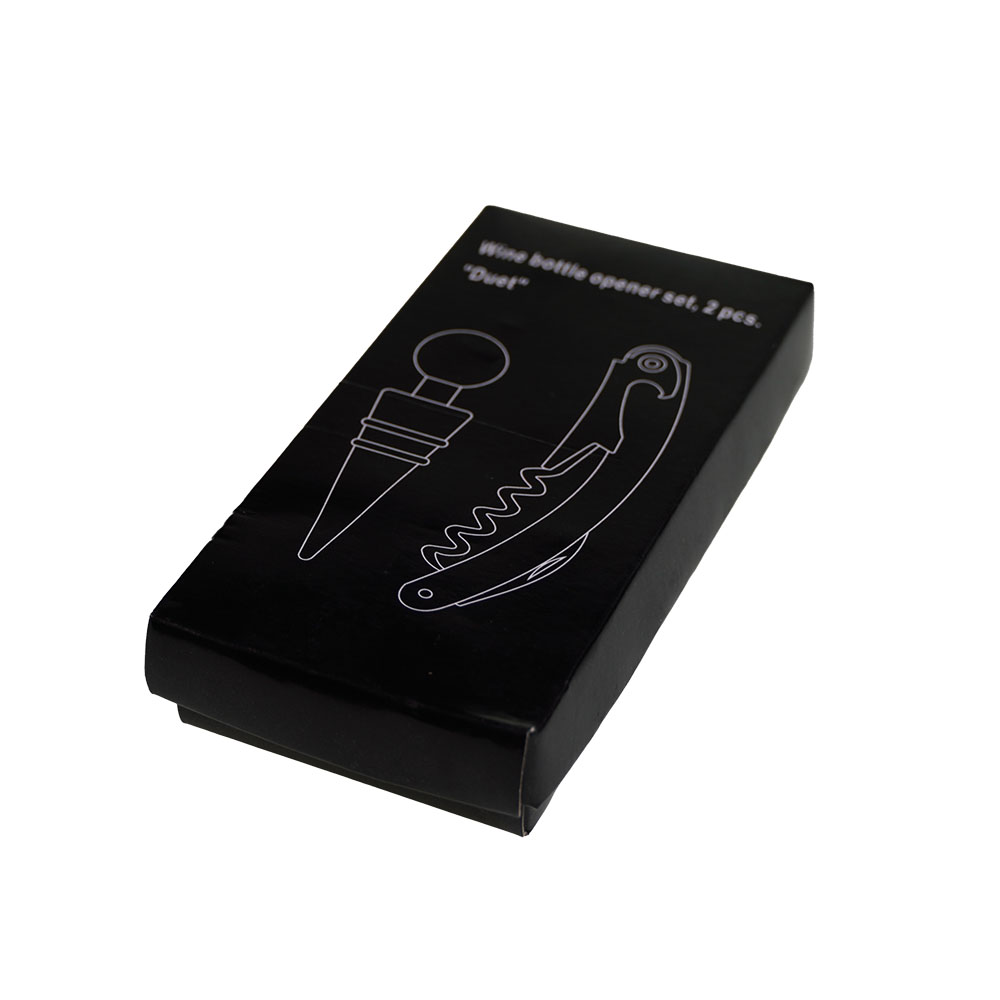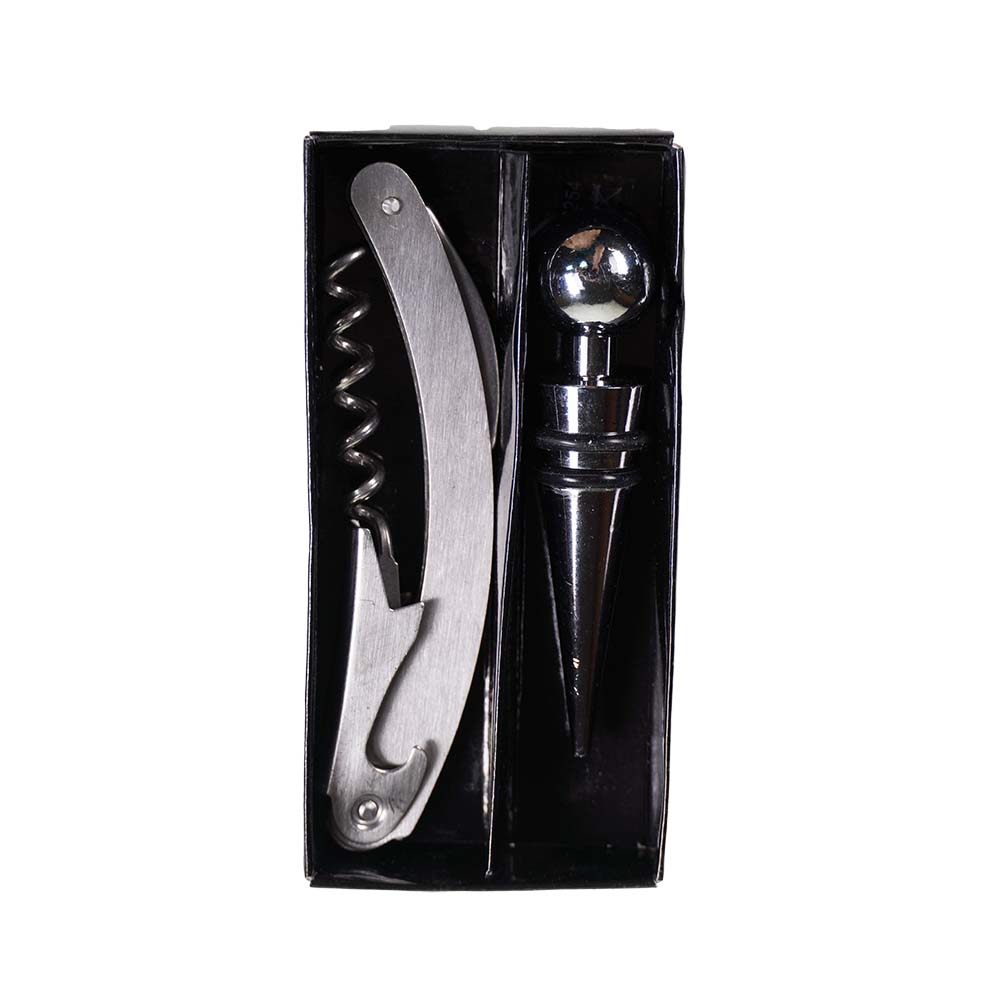 Dvoudílná souprava na víno v krabičce. Sada obsahuje zátku s černými proužky a vývrtku. Rozměry 6x12,5x2 cm. Ćernostříbrná barva.