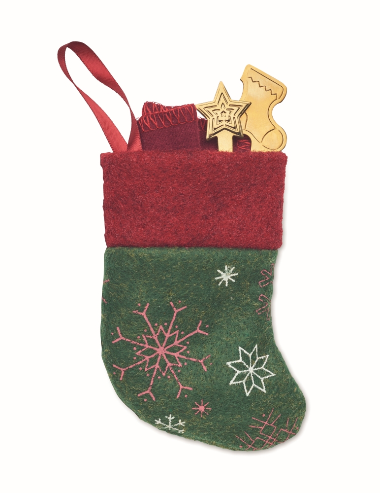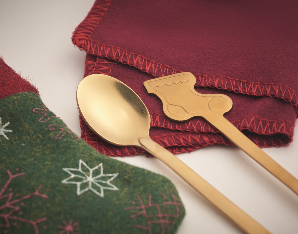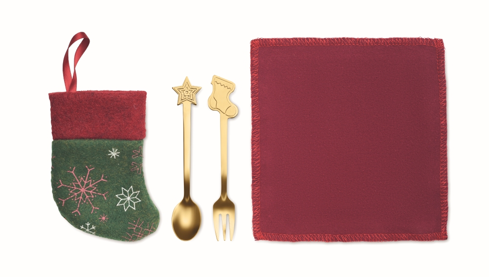 Sada příborů na vánoční dezert obsahující lžíci a vidličku z nerezové oceli a bavlněný 150g ubrousek. Dodáváno v obale ve tvaru vánoční ponožky. Pozice vzoru se může u jednotlivých kusů lišit Rozměry: 8 x 11,5 cm. Materiál: bavlna