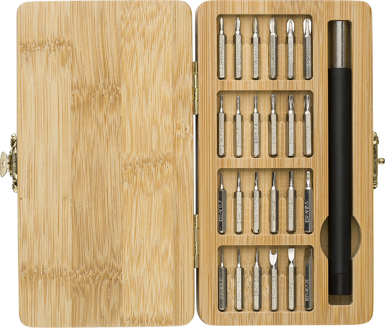 Sada 24 bitů a držáku v bambusovém pouzdře. Baleno v hnědé kartonové krabičce. Rozměry: 14,8 × 8,5 × 2,4 cm.