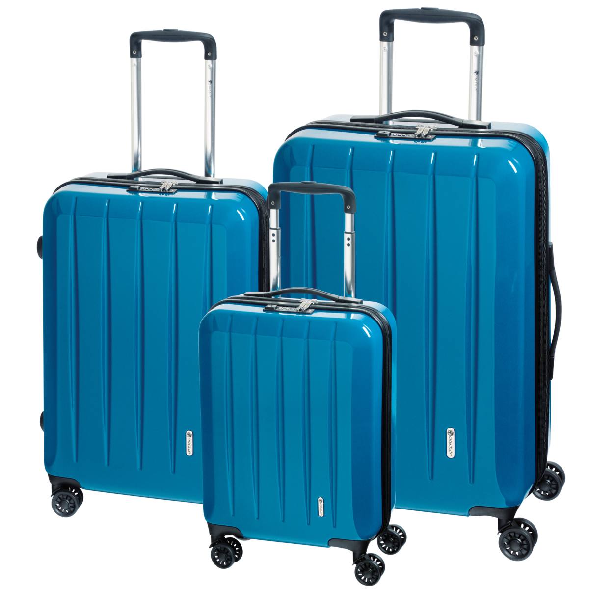 Sada tří skořepinových kufrů. Každý kufr má možnost plnění do obou polovin, kde je křížové upínání a vnitřní dělící přepážka se síťkovou kapsou. Výsuvné kovové madlo a 4 hladce jezdící otočná kolečka zajistí pohodlnou manipulaci. Součástí je TSA číselný zámek. Malý kufr: 55x37x20cm, 2,3kg, 29 l. Střední kufr: 67x45x27cm, 3,6kg, 72 l. Velký kufr: 75x52x31cm, 4,3kg, 110l.