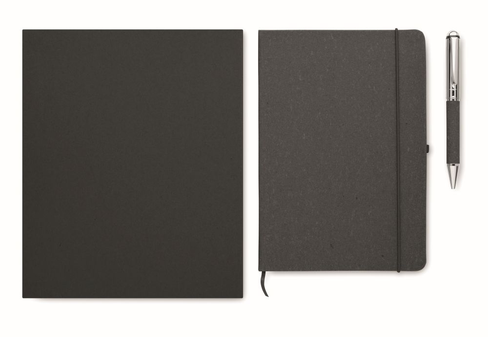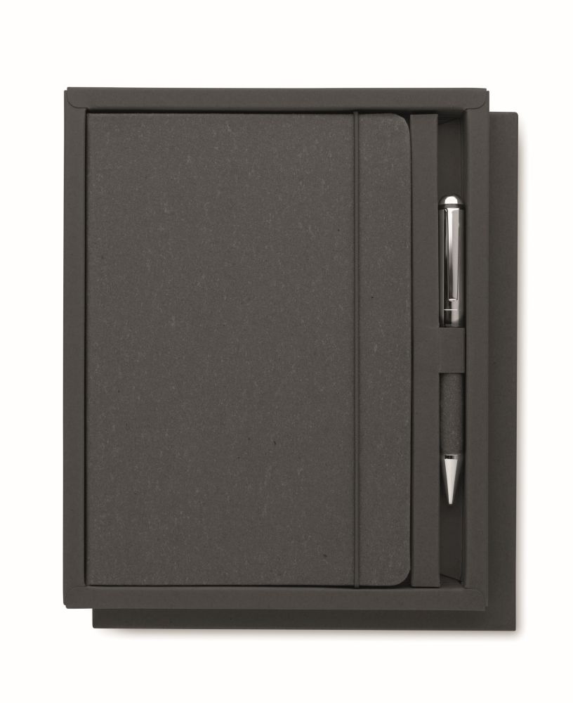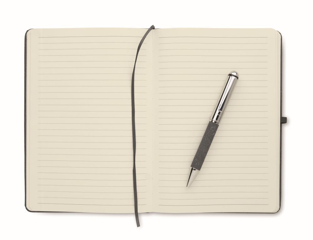 Dárková sada v kraftové papírové krabičce. Zápisník A5 z recyklované kůže (75 %) s pevnou obálkou. 160 linkovaných stran (80 listů). Uzavírací gumička, záložka a držák pera v odpovídající barvě. Modrý inkoust. Rozměry: 24x1.6x19.4cm