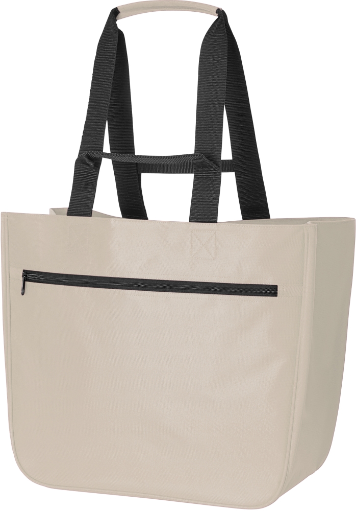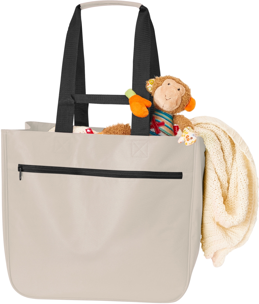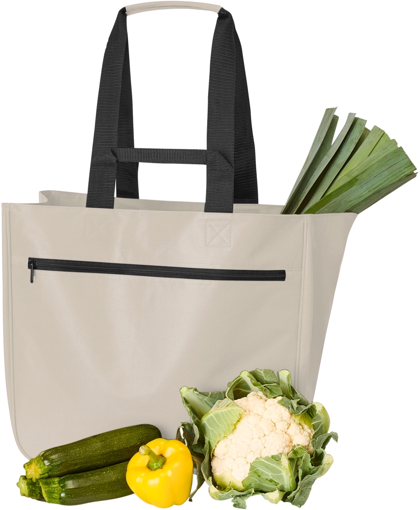Prostorná nákupní taška z recyklovaného polyesteru pro mnohostranné použití. Má velkou hlavní kapsu, přední kapsu na zip a vypolstrovaný úchop pro pohodlnější přenášení. Rozměry: 40 × 37 × 20 cm.
