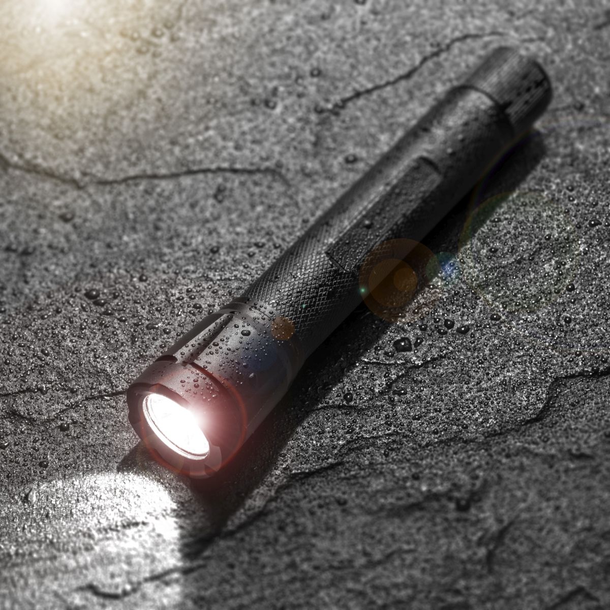 Značková kovová svítilna Schwarzwolf. Svítilna obsahuje 3W CREE XPE LED diodu a má 3 režimy svícení: silný, střední a blikající. Baleno v dárkové krabičce. Svítivost: 120 lumenů. Rozměry: 14,3 × 2,9 cm. Poznámka: dodáváme včetně baterie 2 × AA. Uhlíková stopa: gCO2 e682.