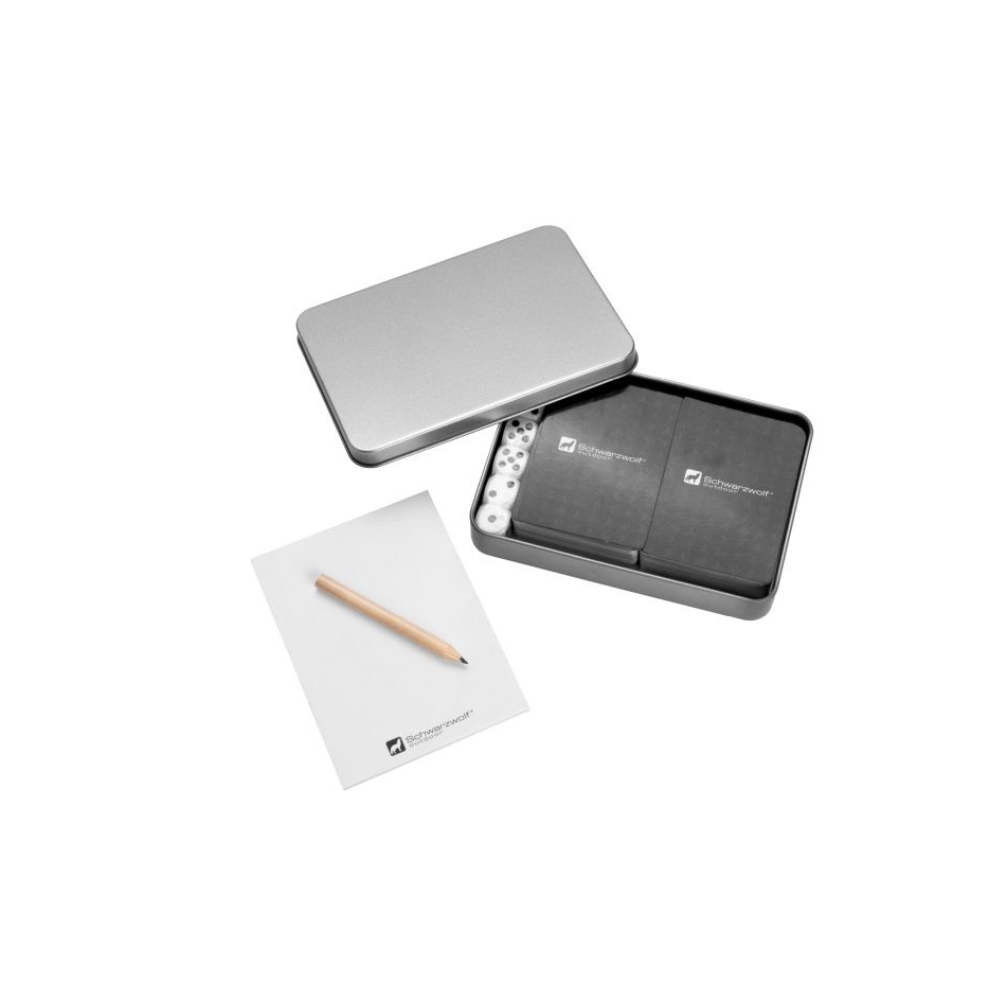 Cestovní sada hracích karet a kostek v plechové krabičce značky Schwarzwolf. Sadu jistě uvítáte například během Vašeho kempování, kdy si s přáteli budete moci zpříjemnit večer u zábavné hry, nebo i doma s rodinou. Sada obsahuje 2 × 54 ks karet s vodoodpudivou povrchovou úpravou, 6 hracích kostek, 15 ks poznámkových papírků a tužku. Baleno v dárkové krabičce. Rozměry: plechová krabička 10 × 2,5 × 14,5 cm, karty 6,2 × 8,7 cm.