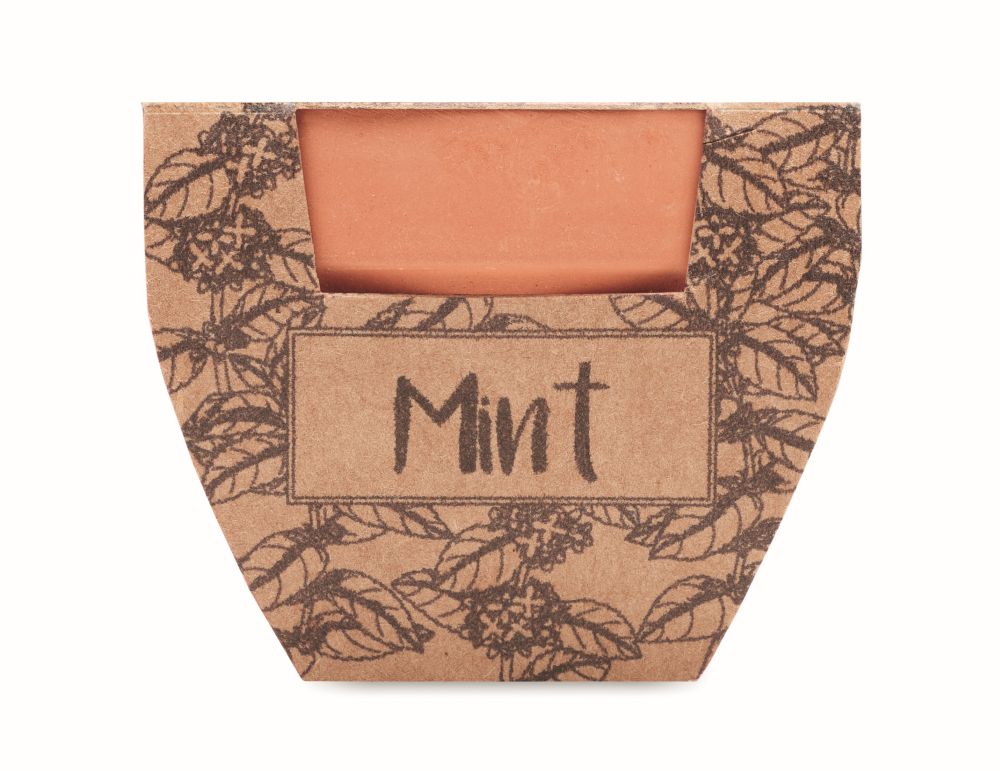 Malý hliněný terakotový květináč se semeny máty a tabletou s půdou. Vyrobeno v EU. Rozměry: 6x5,5x5 cm