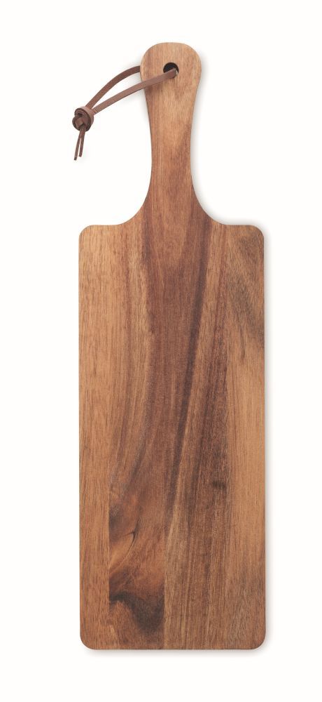 Servírovací prkénko z akáciového dřeva s rukojetí a PU šňůrkou. Rozměry: 38.5x11x0.9cm