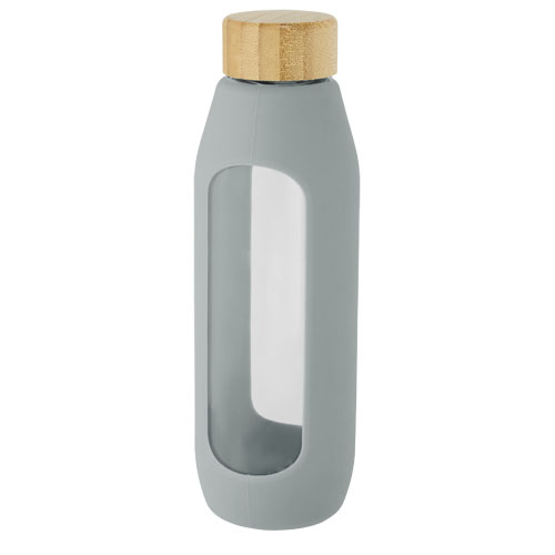 Skleněná láhev, 600ml, s bambusovým víčkem a šedým silikonovým obalem