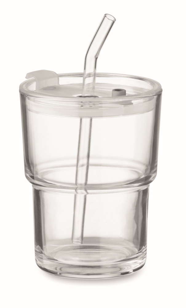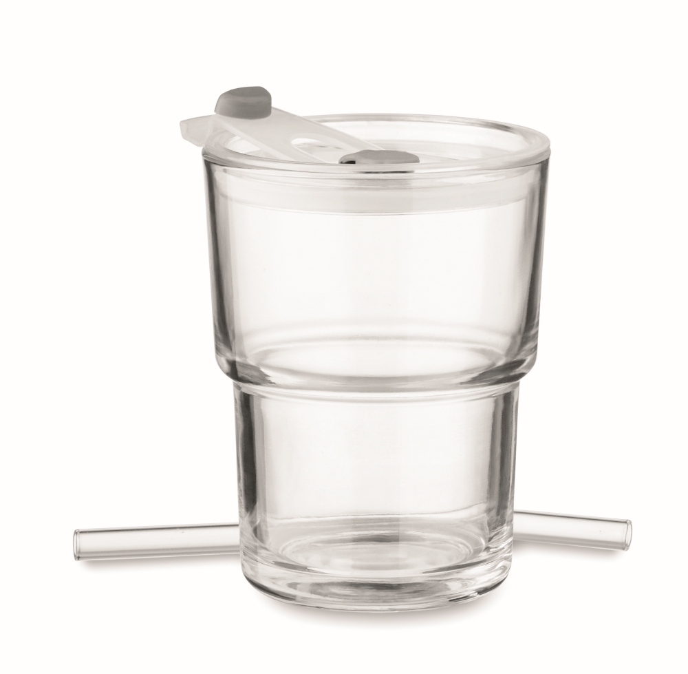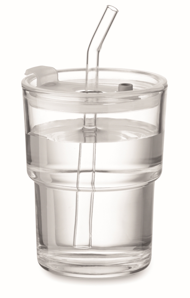 Skleněný pohárek s víčkem a odnímatelným skleněným brčkem. Víčko umožňuje i přímé pití nápoje. Neteče. Objem 300 ml. Rozměry: O 8 x 10,5 cm