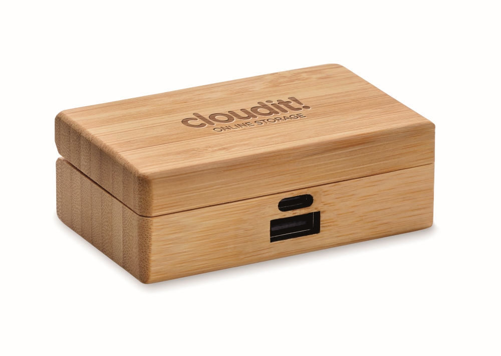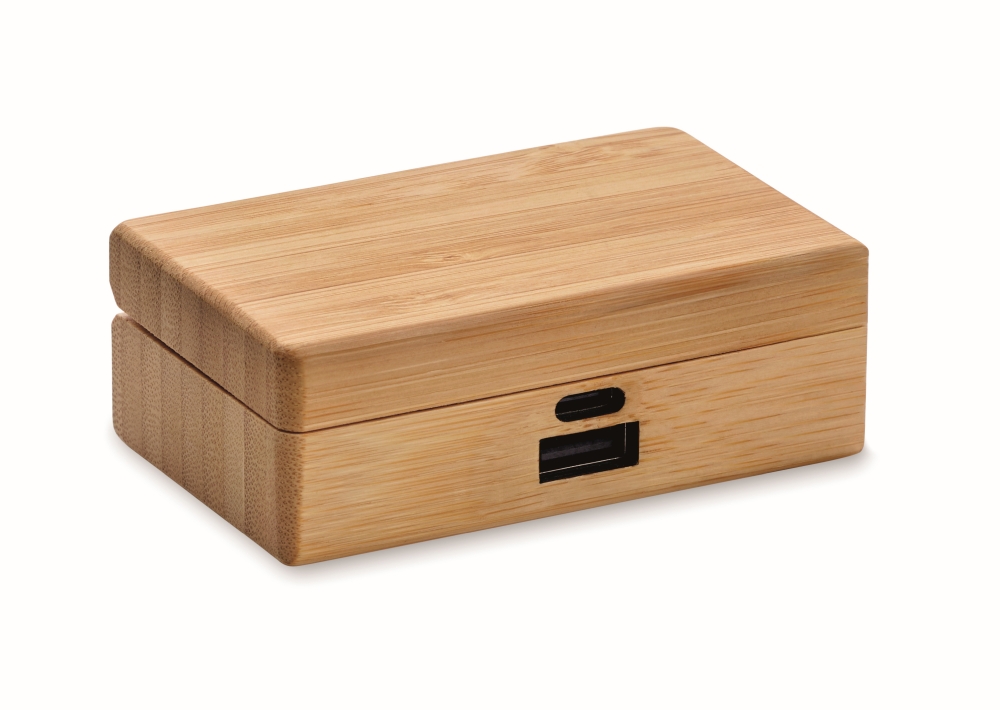 Sluchátka TWS s mikrofonem v bambusovém pouzdře. Součástí je nouzová powerbanka s kapacitou 1200 mAh se vstupem type-C a výstupem type-A. Automatické párování. Rozměry: 8,1 x 5,2 x 2,7 cm