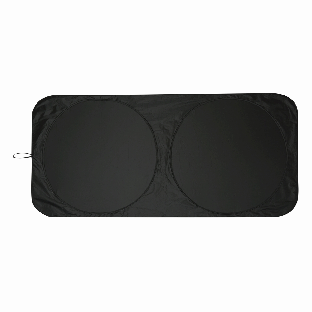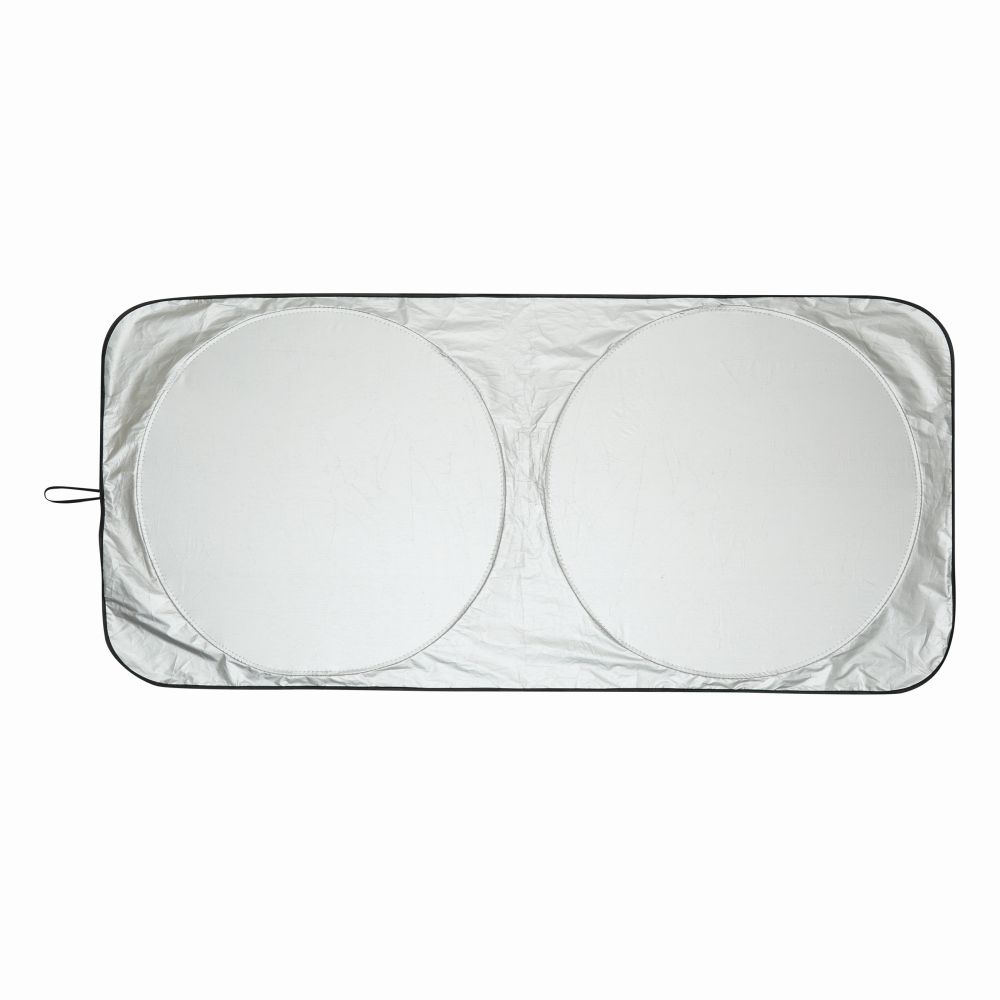 Sluneční clona na čelní sklo automobilu, stříbrný povrch s černou zadní stranou, lze složit a zajistit elastickou smyčkou, vč. pouzdra. Rozměry: 150 x 70 x 0,2 cm