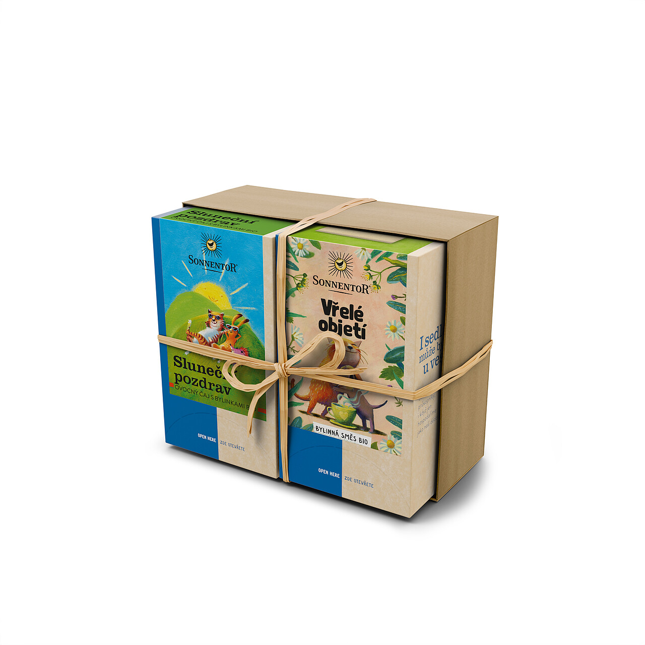 Vřelé objetí - ideální dárková směs pro každého, kdo potřebuje povzbudit. Složení je máta peprná bio, heřmánek bio 15%, šalvěj bio, lípa květ bio 10%, tymián bio 10% a černý bez květ bio. Sluneční pozdrav - jemná ovocno-bylinná směs s harmonickou chutí. Složení je šípek oplodí bio, citronová tráva bio 19%, jablka bio, máta kadeřavá bio, ibišek bio, jahody kousky bio, chrpa květ bio a měsíček květ bio. Rozměry: 8,5 x 14,3 x 12,5 cm