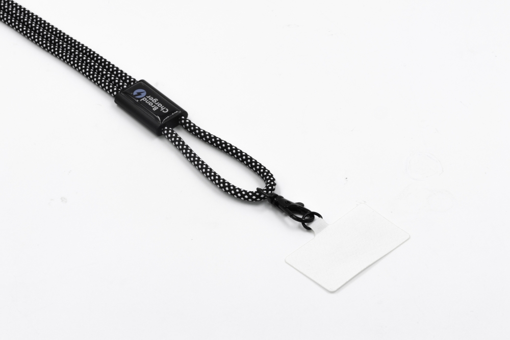 Šňůrka na krk značky BrandCharger s karabinkou a kartičkou na zavěšení mobilního telefonu, vyrobená z recyklovaných PET lahví. Má nastavitelnou délku a je kompatibilní s většinou pouzder na mobilní telefony. Lze nosit jako crossbody. Rozměry: 62 × 2,5 × 1 cm.