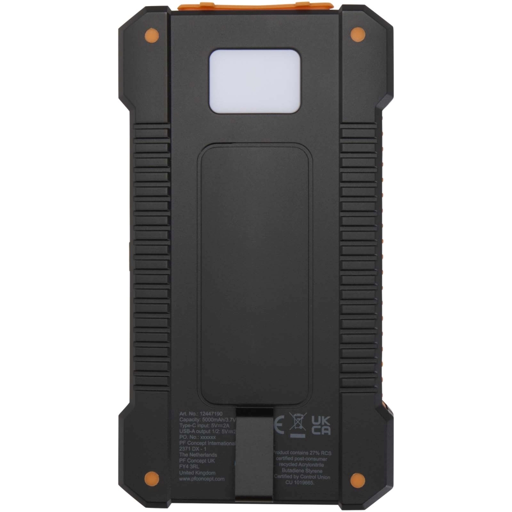 Solární powerbanka z recyklovaného plastu s kapacitou 5000 mAh a výkonem 10 W, odolná, s vestavěnou svítilnou, černá