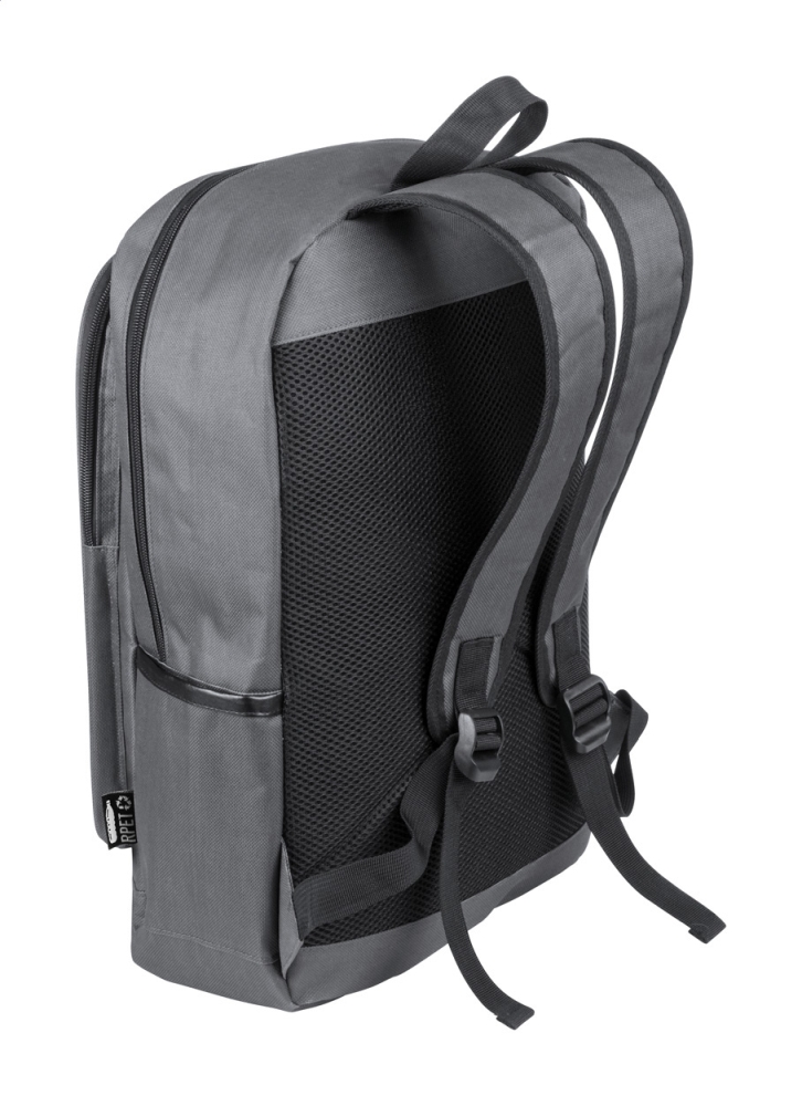 Batoh z recyklovaného RPET polyesteru s hlavním úložným prostorem na zip, dvěmi předními kapsami na zip, bočními kapsami a polstrovanou přihrádkou na notebook (15“). Batoh má vypolstrované ramenní popruhy a zádový systém. Rozměry: 32 × 44 × 18 cm.