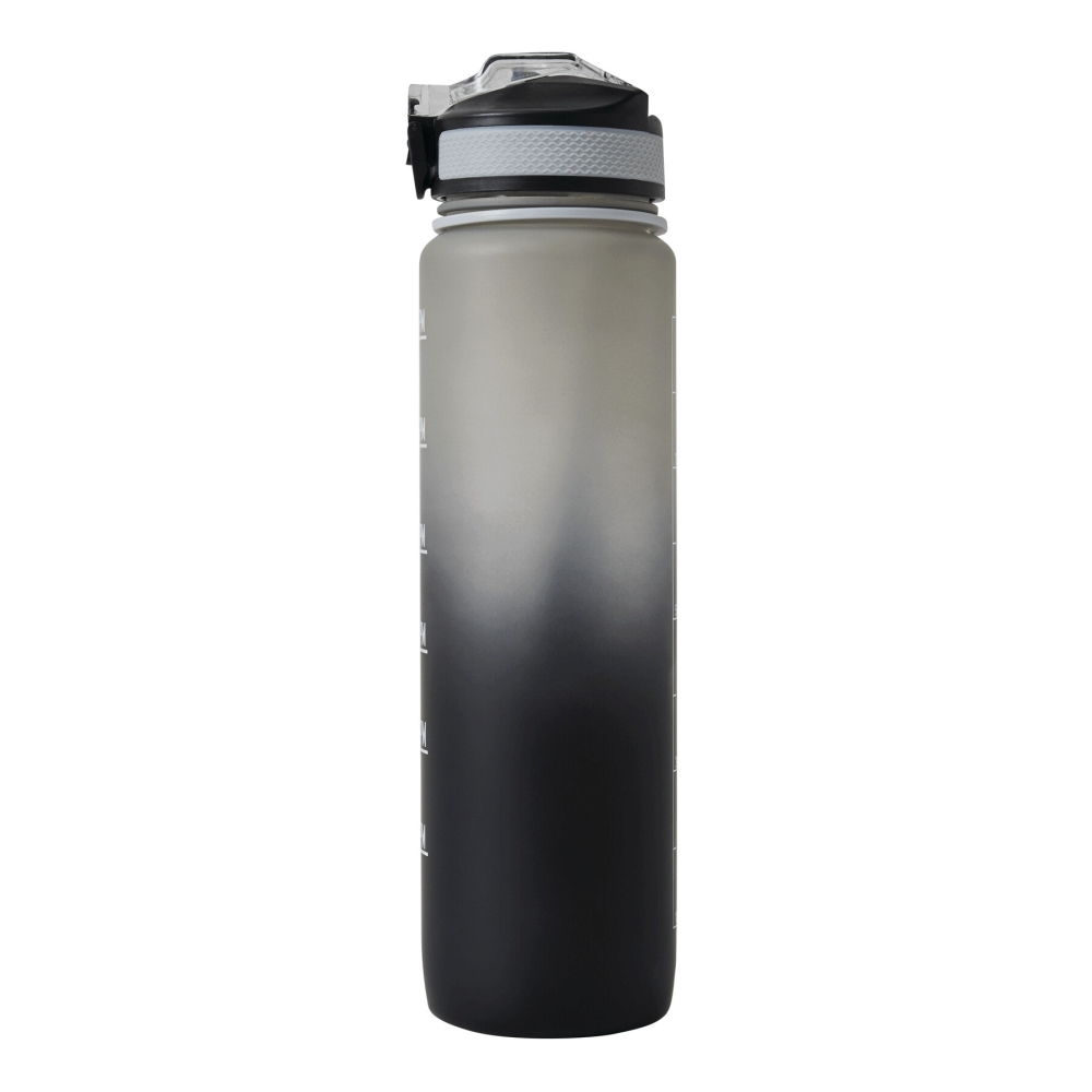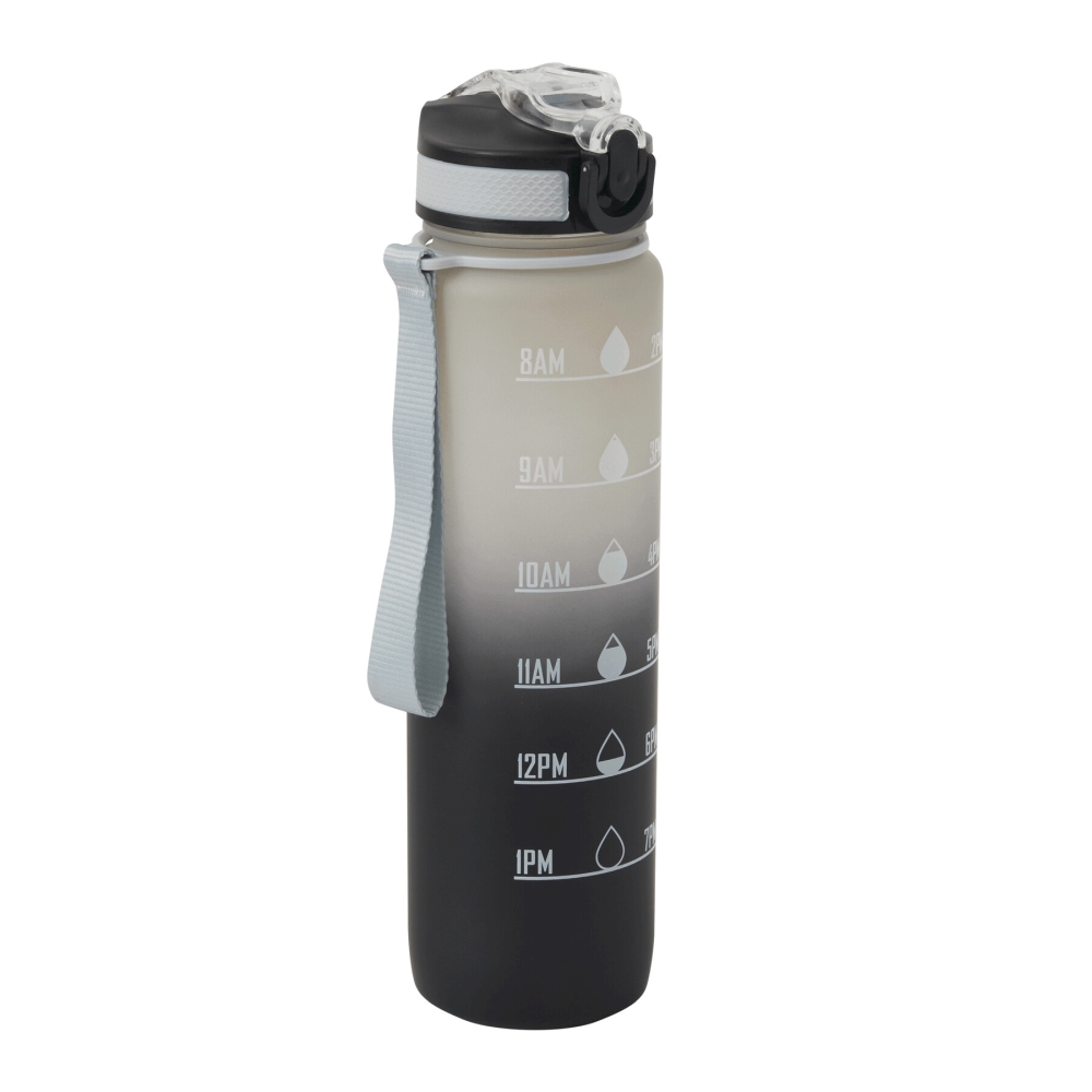 Sportovní láhev na vodu. Matná, barevná láhev z odolného PETG, barevně sladěný plastový šroubovací uzávěr se silikonovým těsnicím kroužkem, stisknutím tlačítka se vyklopí výpust i kryt (ovládání jednou rukou), s bezpečnostním zámkem, integrované, odnímatelné brčko s měkkým silikonovým náustkem, motivační stupnice času a objemu vody (denní doba / ml), s poutkem na ruku, objem cca 1 000 ml, baleno v krabičce. Rozměry: O7 x 29 cm
