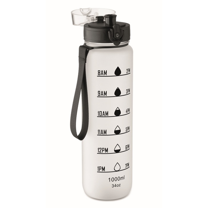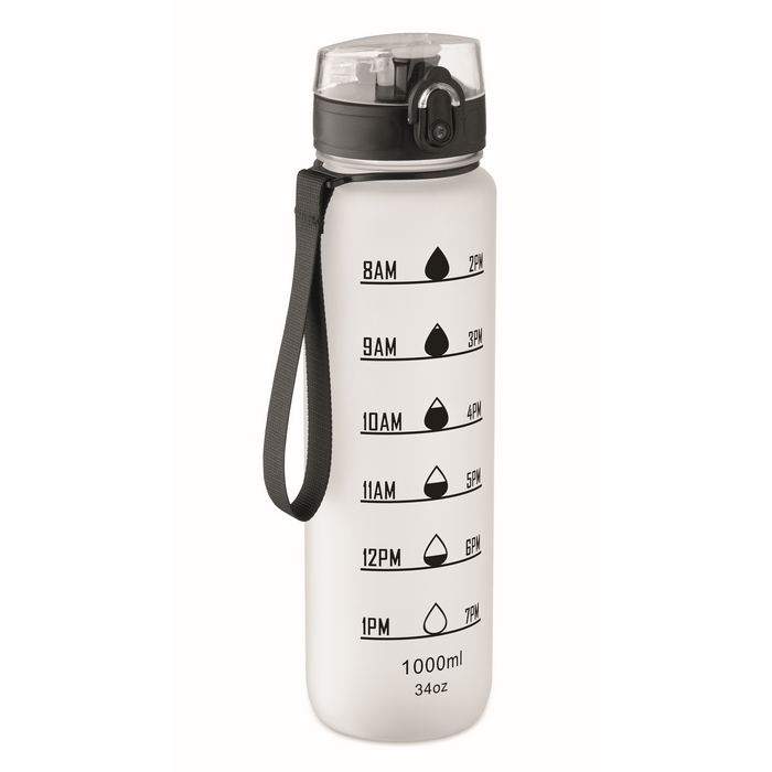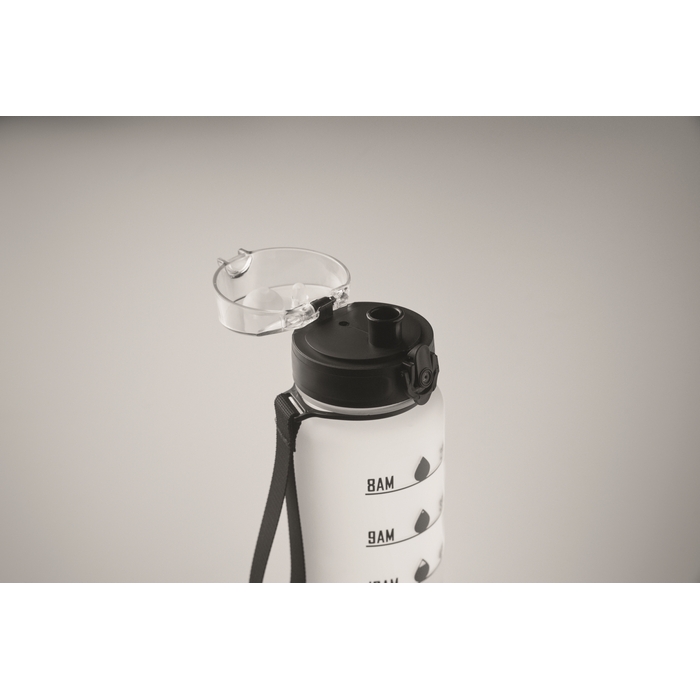 Sportovní RPET láhev na vodu, motivační časové značky, víčko otevíratelné jednou rukou, bezpečnostní zámek a popruh na přenášení. Objem: 1 l.Rozměry: O7,5 x 28,5cm