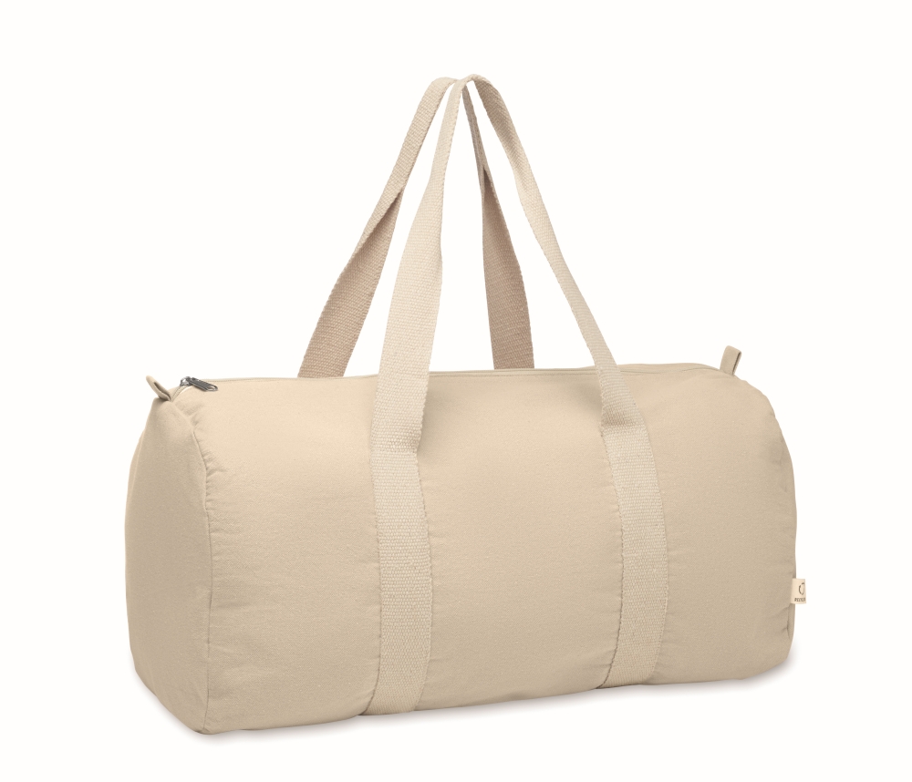 Sportovní nebo cestovní taška s boční přihrádkou na zip a vnitřní kapsou na zip z recyklované 320g bavlny (80 %) a recyklovaného polyesteru (20 %) s dlouhými uchy. Rozměry: 50 x 25 x 25 cm