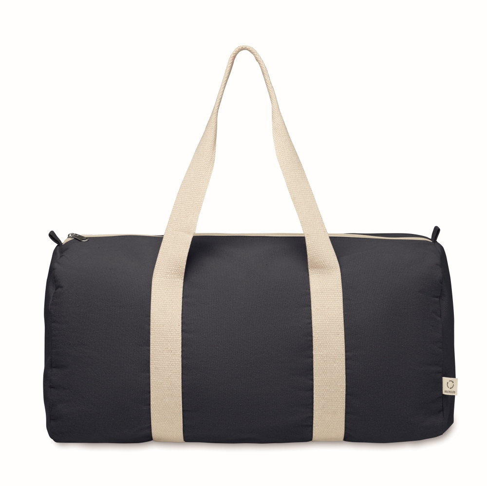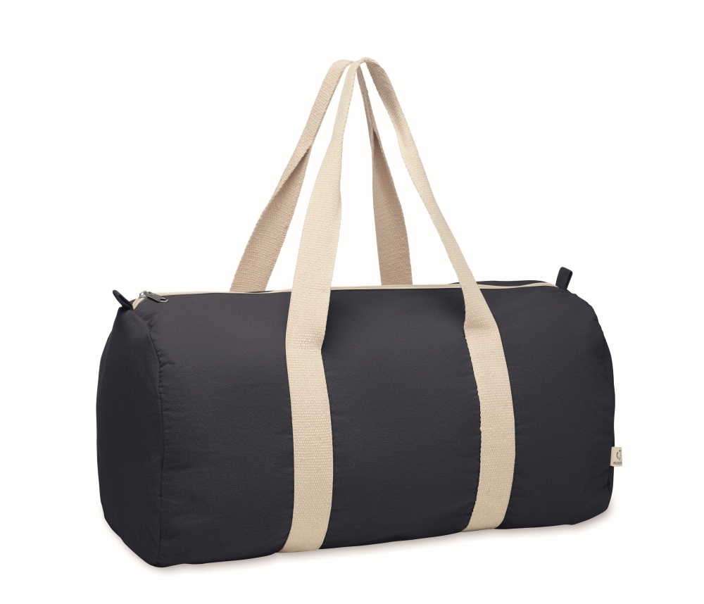 Sportovní nebo cestovní taška s boční přihrádkou na zip a vnitřní kapsou na zip z recyklované 320g bavlny (80 %) a recyklovaného polyesteru (20 %) s dlouhými uchy. Rozměry: 50 x 25 x 25 cm