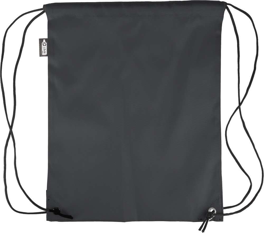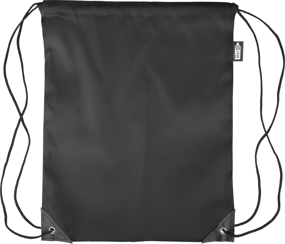 Stahovací batoh z polyesteru 210D se dvěma černými PU rohy na přední straně a vnitřním prošitím. Má černou nylonovou šňůrku na každé straně, zapínání na stahovací šňůrku a jednu vnitřní přihrádku. Objem: 5 l. Nosnost: 7 kg. Včetně štítku z rPET. Rozměry: 34 x 0,1 x 42 cm