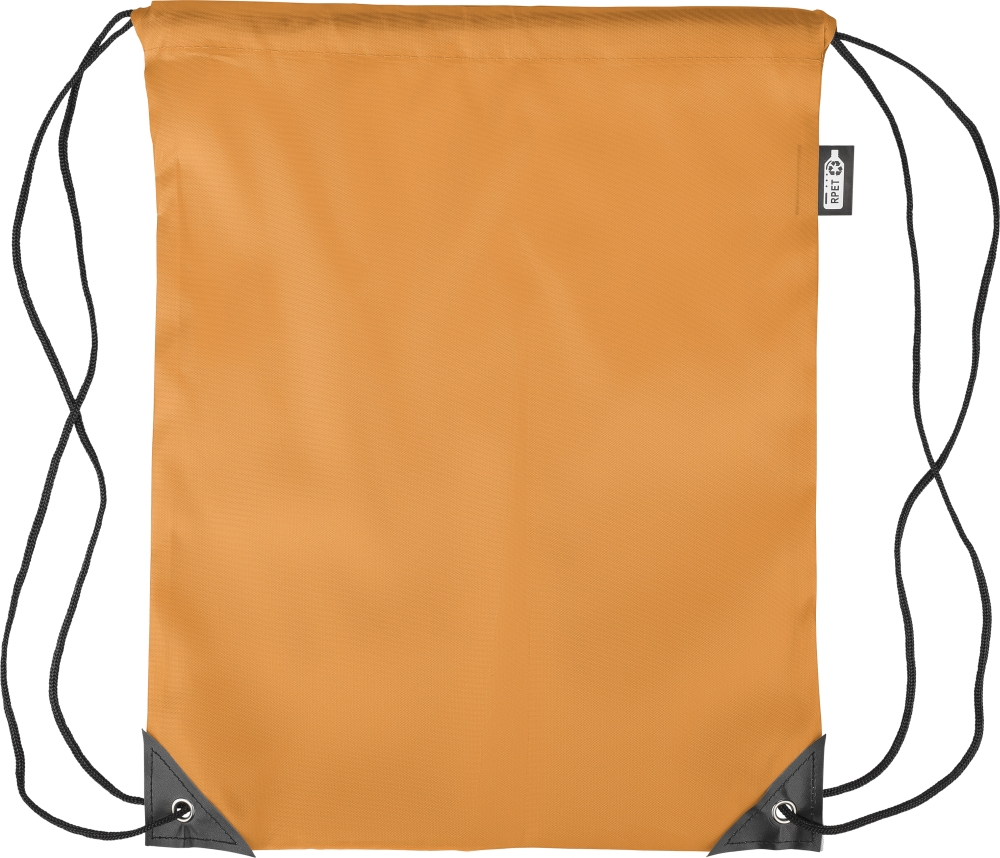 Stahovací batoh z polyesteru 210D se dvěma černými PU rohy na přední straně a vnitřním prošitím. Má černou nylonovou šňůrku na každé straně, zapínání na stahovací šňůrku a jednu vnitřní přihrádku. Objem: 5 l. Nosnost: 7 kg. Včetně štítku z rPET. Rozměry: 34 x 0,1 x 42 cm