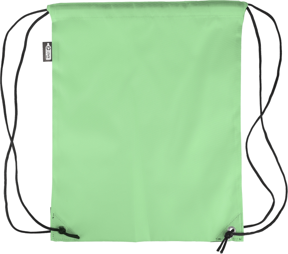 Stahovací batoh z polyesteru 210D se dvěma černými PU rohy na přední straně a vnitřním prošitím. Má černou nylonovou šňůrku na každé straně, zapínání na stahovací šňůrku a jednu vnitřní přihrádku. Objem: 5 l. Nosnost: 7 kg. Včetně štítku z rPET. Rozměry: 34 x 0,1 x 42 cm