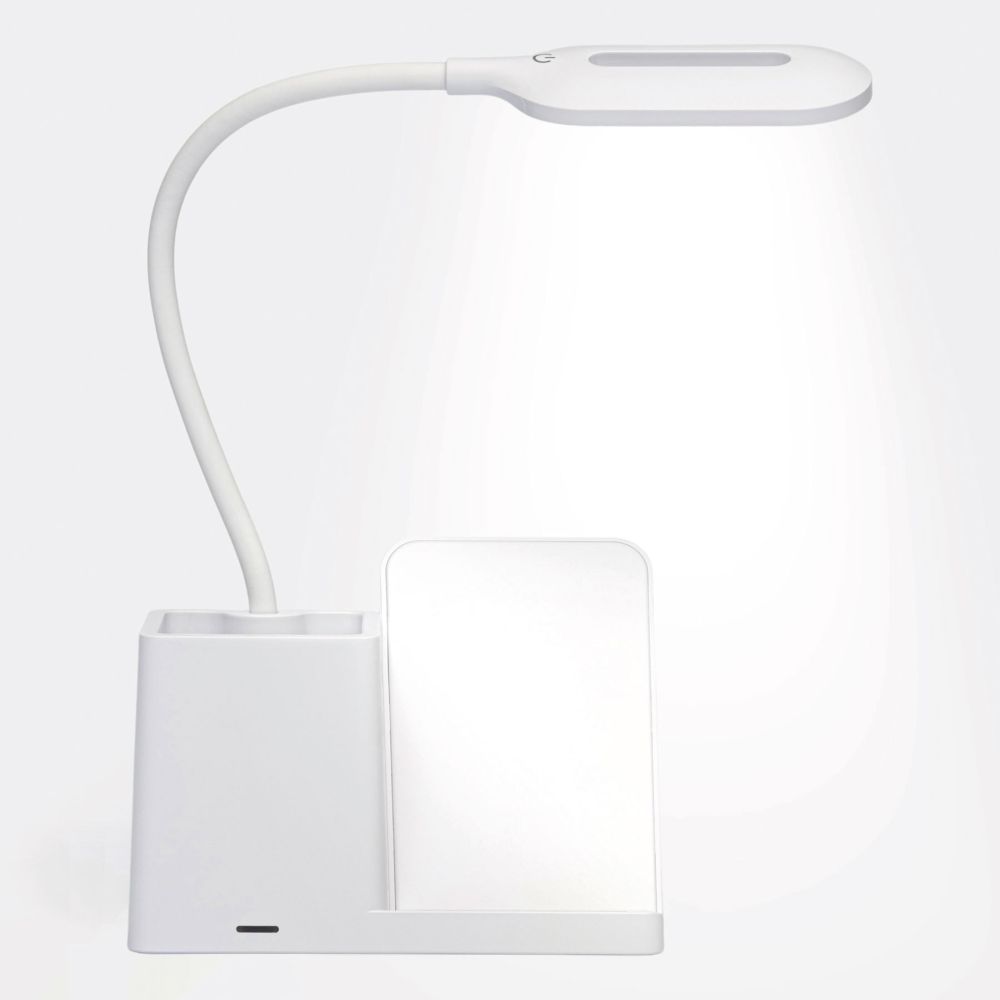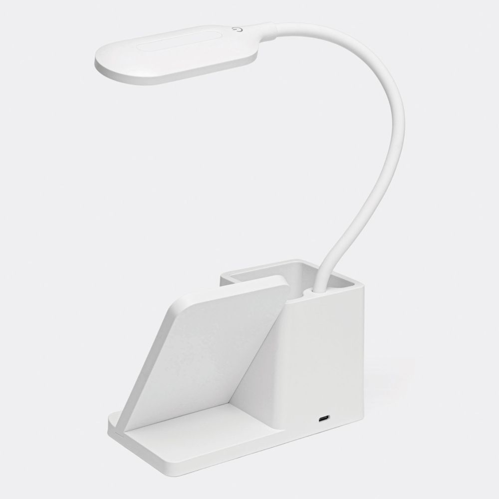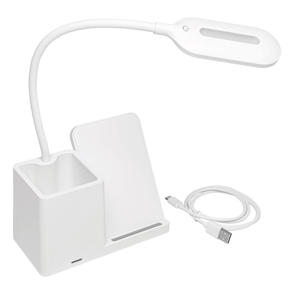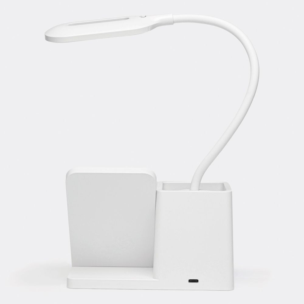 Stojan na psací potřeby doplněný stolní lampou a bezdrátovou nabíječkou. Lampa má 360° flexibilní otočné rameno s 10 teplými bílými a 10 studenými bílými LED diodami, dotykové zapínání/vypínání. Bezdrátové nabíjení se spustí položením nabíjeného zařízení na plochu nabíječky (zařízení musí být podporovat indukční nabíjení). Nabíječka má USB kabel s konektorem USB typu C (délka cca 102 cm), kontrolka ovládání, příkon: 5V/9V, 2A, výstupní výkon: max. 10 W, s regulací teploty a detekcí cizích předmětů, 4 protiskluzové nožičky na spodní straně. Rozměry: 7,5 x 15 x 28-44 cm