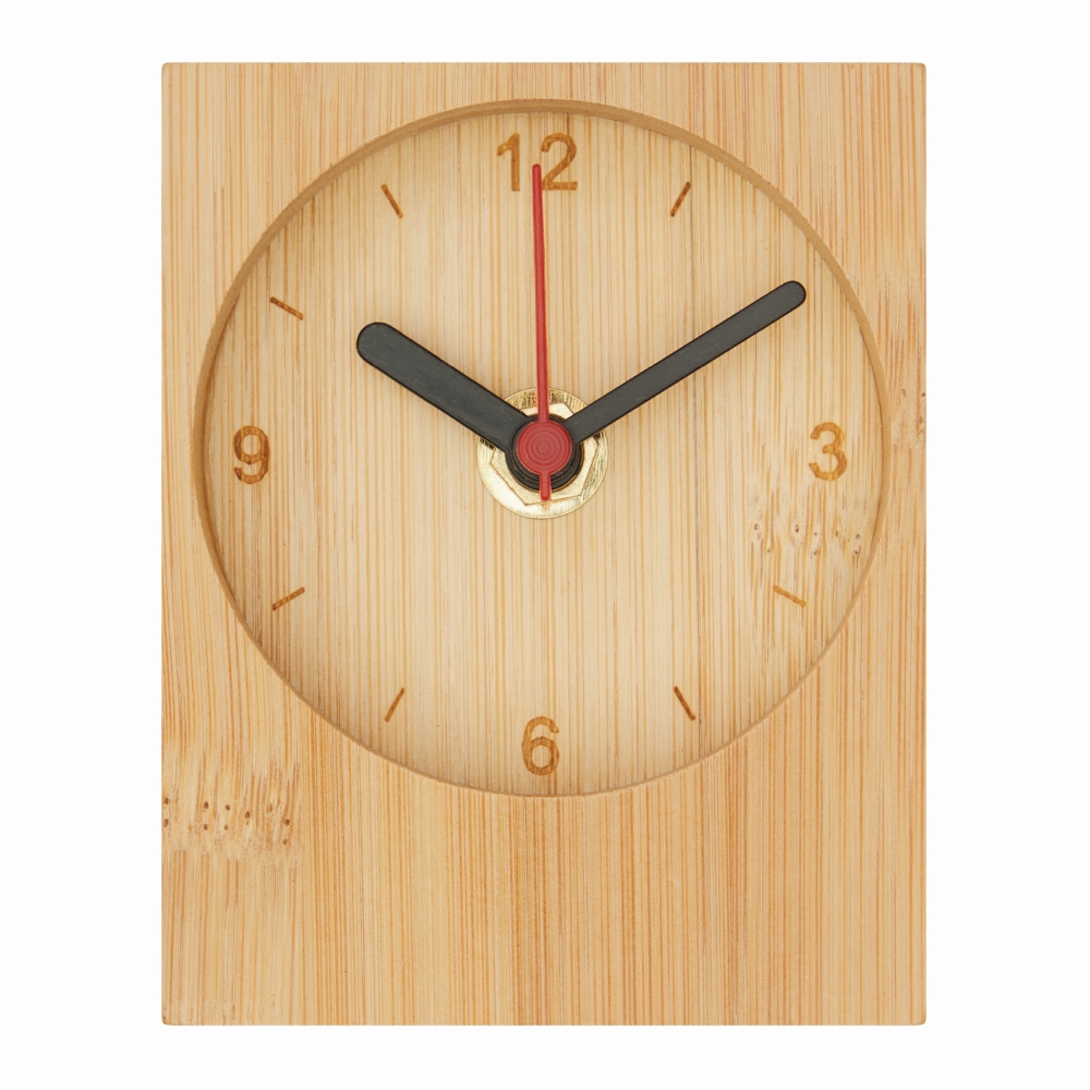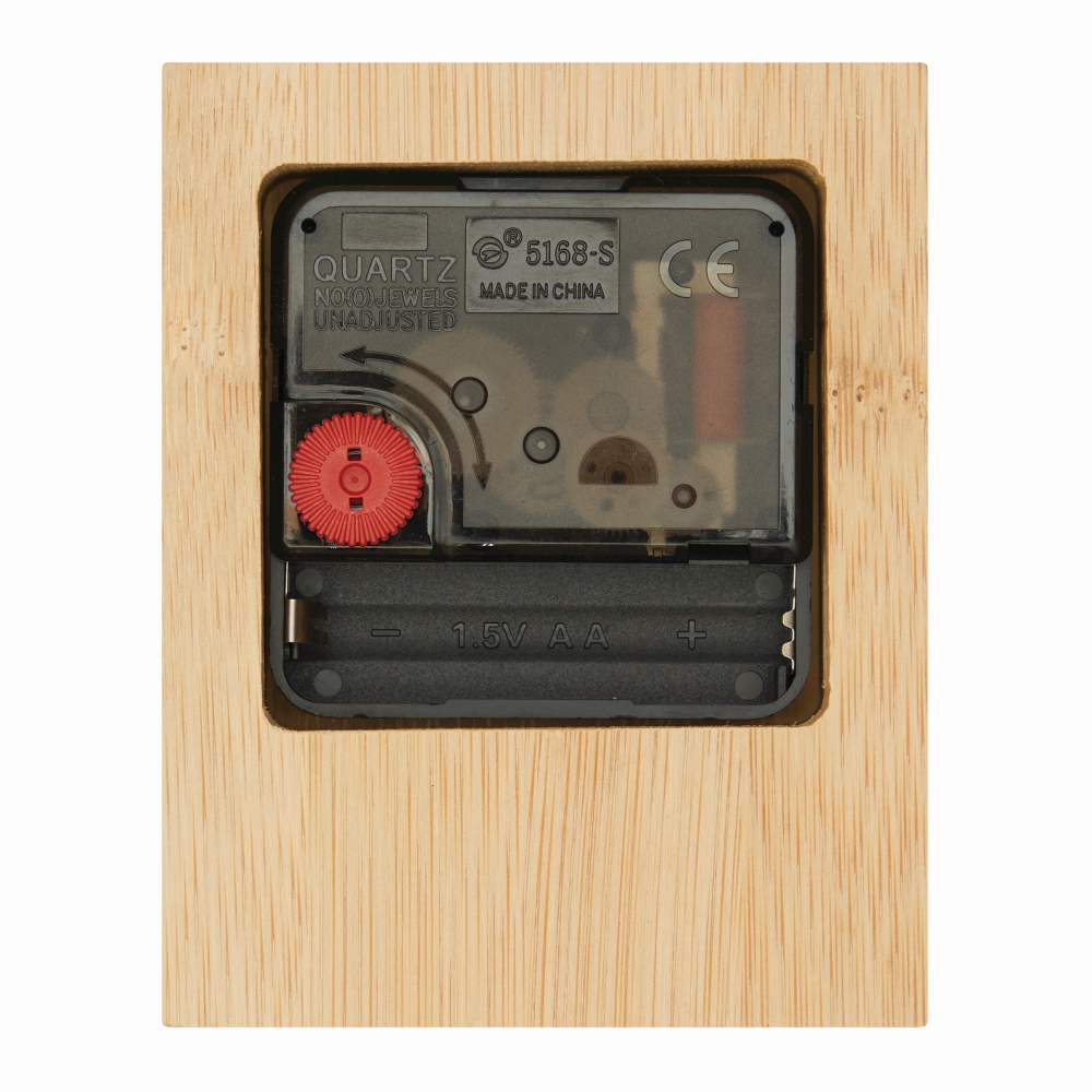 Stolní hodiny bambus, s analogovým, nehlučným zobrazením času (hodiny, minuty a sekundy), na baterie (1 x AA baterie není součástí dodávky). Rozměry: 8 x 10 x 4,1 cm