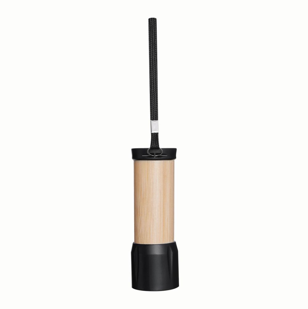 LED svítilna s 9 bílými diodami. Vyrobeno z recyklovaného plastu a bambusu. Vypínání a zapínání tlačítkem, poutko na nošení. Baleno v dárkové krabičce. Rozměry: O3,4 x 10 cm