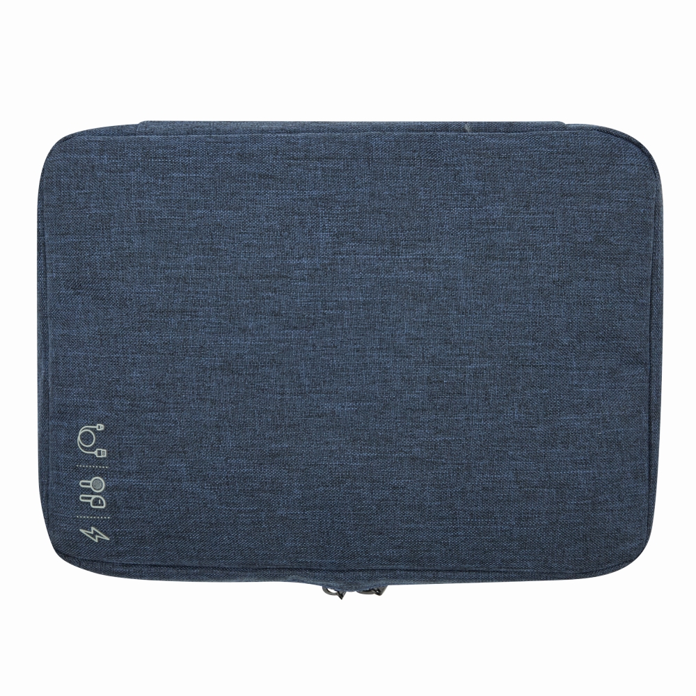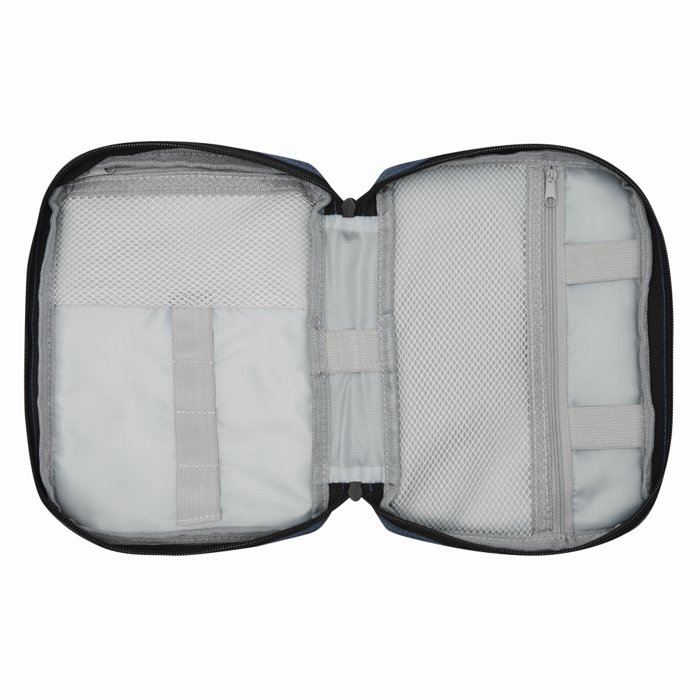 Organizér na kabely a počítačové doplňky, uzavíratelný na zip. Obsahuje 2 síťované kapsy uzavíratelné na zip a elastické gumičky. Materiál 3000D polyester. Rozměry: 23 × 16,5 × 5 cm.