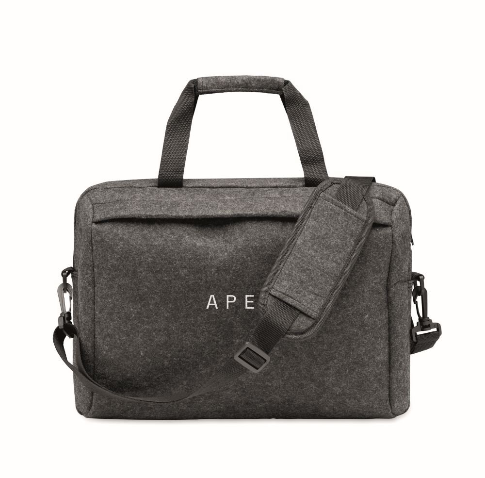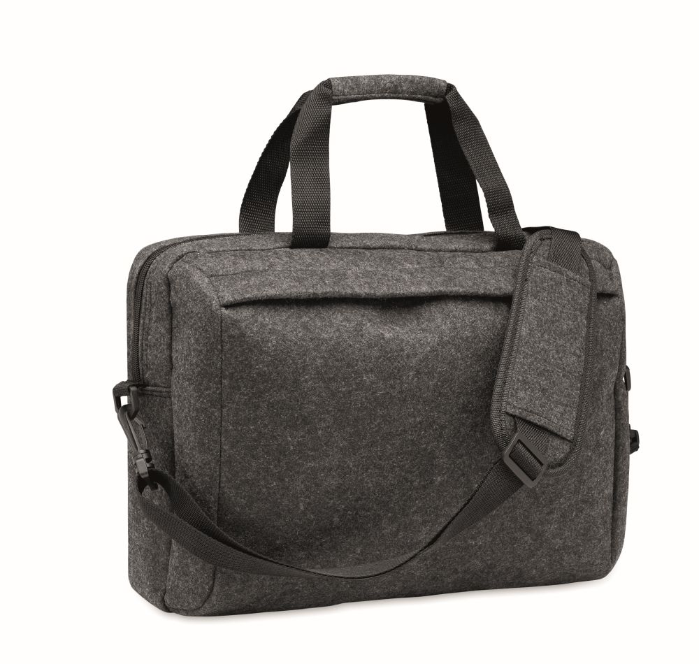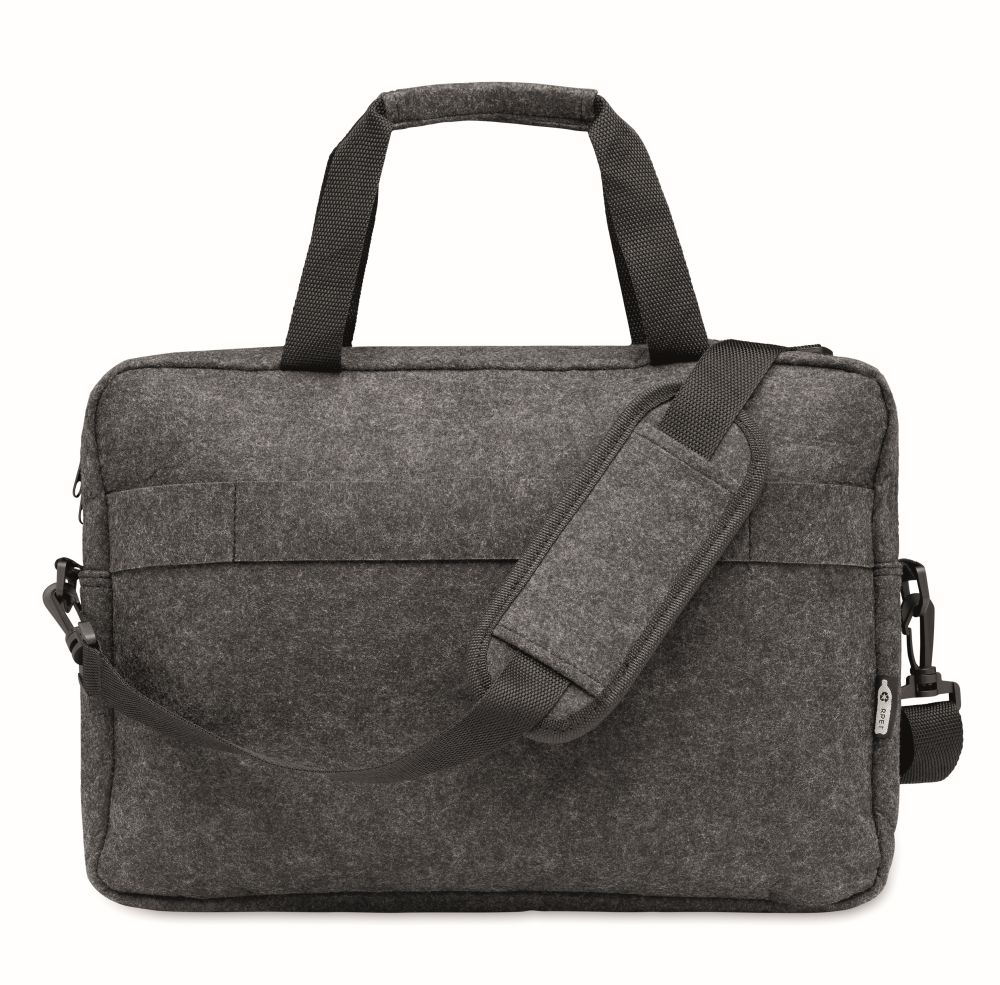 RPET taška na 15palcový notebook včetně jedné hlavní vnitřní přihrádky a jedné přední kapsy na zip. Nastavitelný ramenní popruh. Držák na kufřík na zadní straně. Rozměry: 40.5x7x28cm