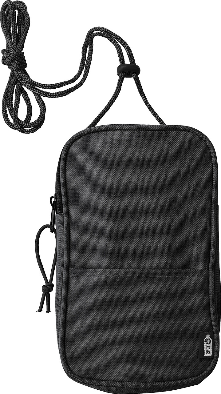 Taška přes rameno z 600D recyklovaného polyesteru s nastavitelnou šňůrkou. Jedna velká přihrádka na zip s gumičkou a vkládací kapsou. Zip má gumičkové táhlo. Rozměry: 30 × 12 × 2,5 cm.