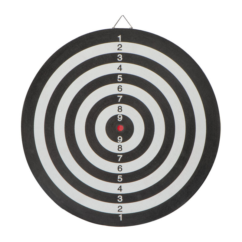 Oboustranný terč se 6 šipkami a kovovým očkem na zavěšení. Rozměry: o 40 x 1 cm