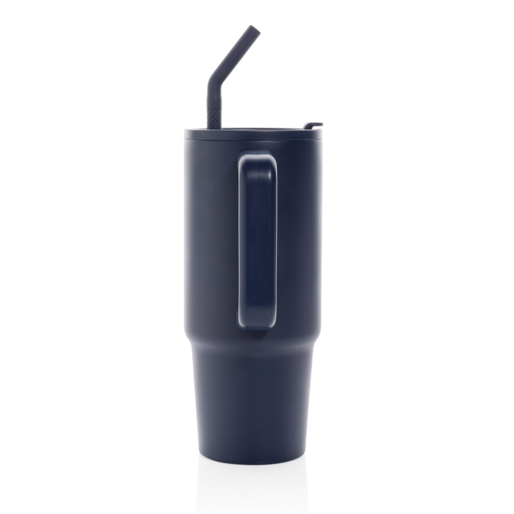 Trendy objemný termohrnek s ergonomickým uchem pro pohodlné nošení. Zúžená spodní část pasuje do většiny automobilových držáků na nápoje. Dvoustěnná vakuová izolace, objem 900 ml, víčko chránící proti rozlití, kovové brčko se silikonovým koncem. Vhodné pr