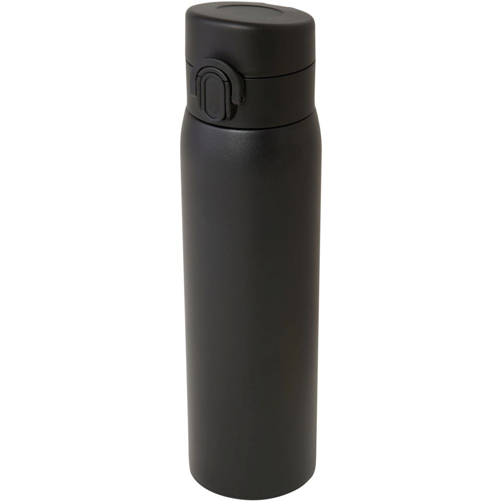 Stylová termoska z recyklované nerezové oceli s certifikací RCS a mechanismem snadného otevírání tlačítkem. Termoska je nepropustná a díky vakuové měděné izolaci nápoje vydrží horké nebo studené několik hodin. Objem je 450 ml. Dodává se v dárkové krabičce z recyklované lepenky. Rozměry: 6,9 x 21,4 x 6,9 x O 6,5 cm.