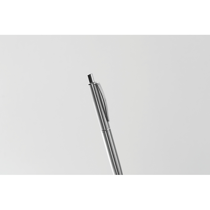 Tlačítková propiska v těle z recyklované nerezové oceli. Modrý inkoust. Dodáváno v dárkové krabičce.Rozměry: 17,5 x 2,8 x 2,2cm