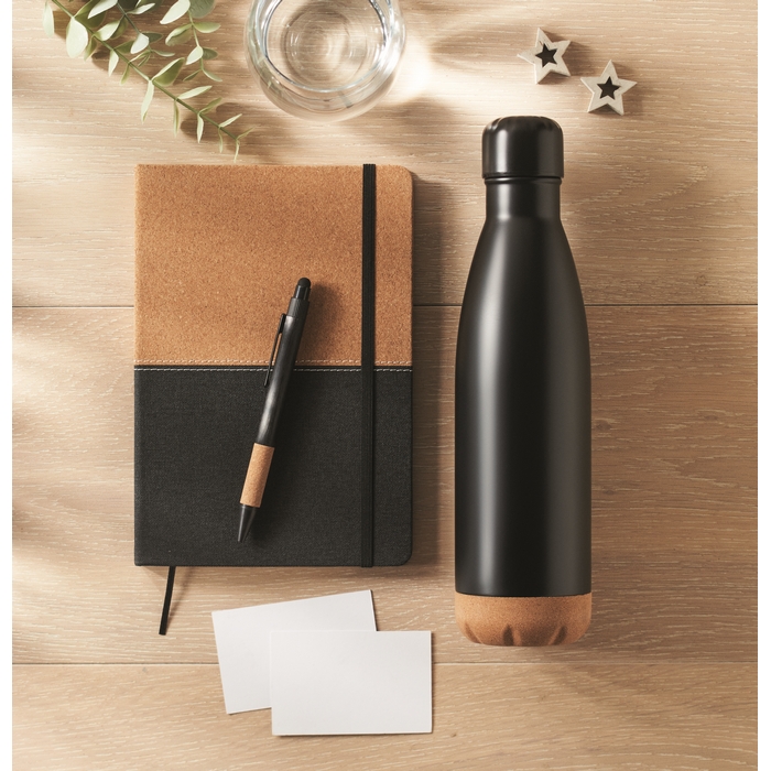 Třídílná dárková sada obsahující dvoustěnnou nerezovou 500 ml láhev, zápisník A5 s RPET a korkovým obalem, 160 linkovanými stránkami z recyklovaného papíru (80 listů) a hliníkové kuličkové pero. Modrý inkoust.Rozměry: 28 x 23,5 x 7,8cm