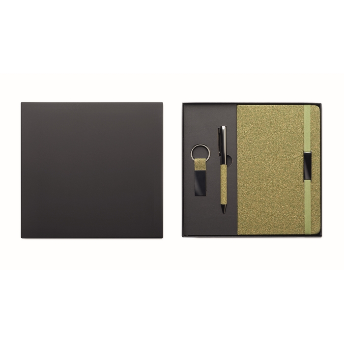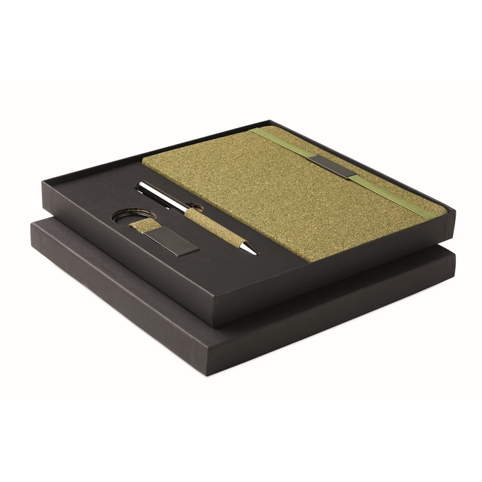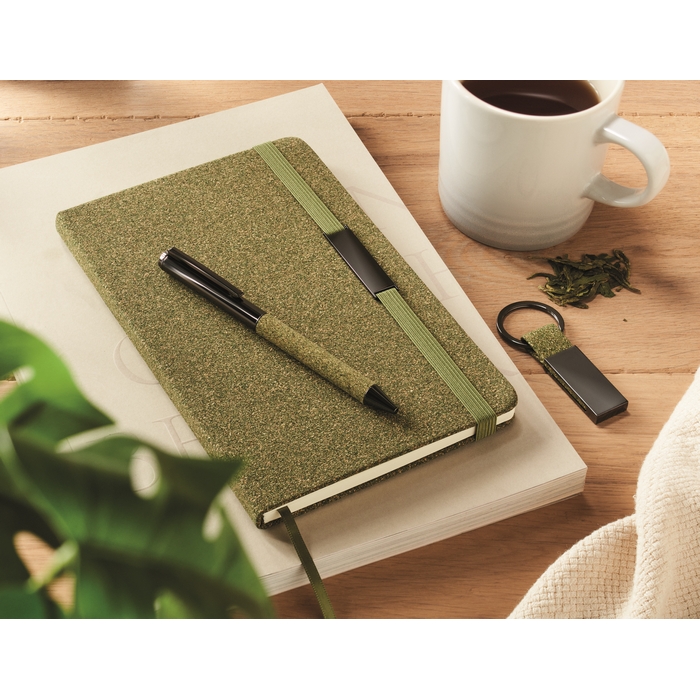 Sada A5 zápisníku s tvrdými deskami (160 linkovaných stran recyklovaného 70g papíru), propisky a přívěsku na klíče. Části vyrobené z 20 % čajové sedliny, 30 % korku a 50 % polybavlněné látky.Rozměry: 22,6 x 21,6 x 2,5cm