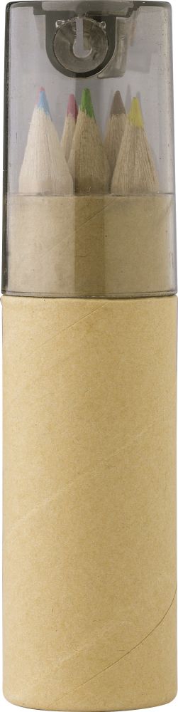 6 pastelek a ořezávátko v papírové tubě, plast/dřevo. Rozměry: O 2,5 × 10,5 cm.