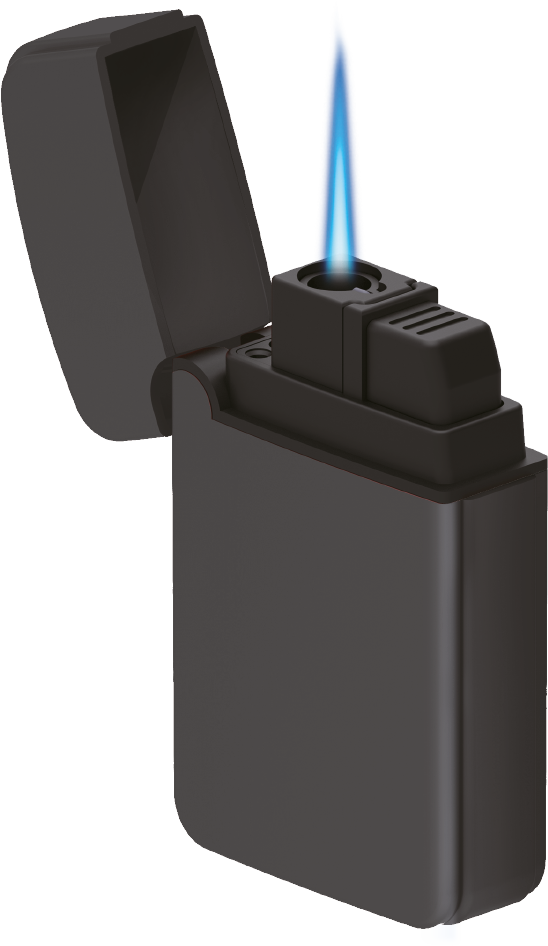 Plastový zapalovač s turbo plamenem, plnitelný. Na vyžádání je možnost dárkové krabičky, která není součástí balení. Rozměry: 4 × 8,3 × 1,8 cm.