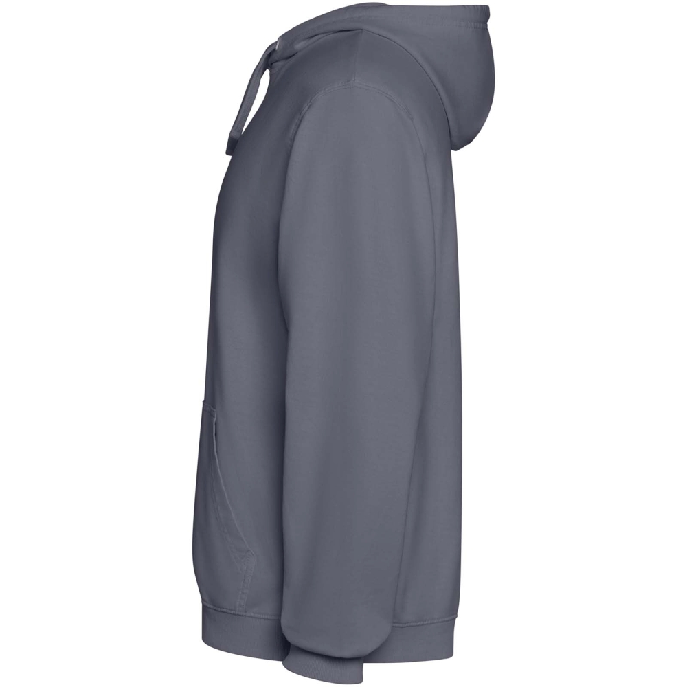 Unisex mikina s kapucí se sepraným vzhledem. Žebrované manžety a lem 2 × 1. Kapuce s podšívkou z jednolícního žerzeje v tónu látky se sladěnými plochými šňůrkami. Krycí steh v tónu látky u krku. Klokaní kapsa.
