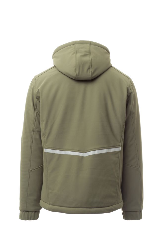 WP 8000 mm H2O, WVT 5000 g/m2 24h. Pánský zateplený softshell, zapínání na zip SBS s kovovým jezdcem „semi-auto lock“ a přizpůsobeným taháčkem. Odnímatelná kapuce se stahovací šňůrkou. Vnitřní límec s flísovými bočními prvky. Reflexní pruhy na zádech a zadní straně kapuce. Elastické stahovací manžety na suchý zip. Dvě boční kapsy na zip, jedna kapsa na hrudi s voděodolným zipem a jedna kapsa na levé paži s integrovaným očkem na pero na zip. Fluorescentní taháčky. Jedna vnitřní prostřižená kapsa na suchý zip. Spodní část stažitelná pomocí přizpůsobených zarážek.