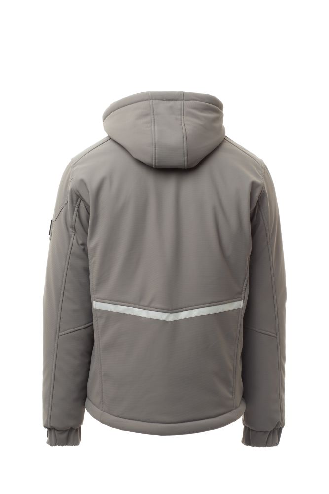 WP 8000 mm H2O, WVT 5000 g/m2 24h. Pánský zateplený softshell, zapínání na zip SBS s kovovým jezdcem „semi-auto lock“ a přizpůsobeným taháčkem. Odnímatelná kapuce se stahovací šňůrkou. Vnitřní límec s flísovými bočními prvky. Reflexní pruhy na ramenou, zádech a zadní straně kapuce. Elastické stahovací manžety na suchý zip a vnitřní návlek. Tepelně zatavená kapsa na hrudi s voděodolným zipem. Dvě boční kapsy na zip s reflexním prvkem. Jedna kapsa na levé paži s integrovaným očkem na pero na zip. Fluorescenční taháčky. Dvě vnitřní kapsy, jedna pravá tvarovaná na hrudi na zip a druhá na tablet na suchý zip. Spodní část stažitelná pomocí přizpůsobených zarážek.