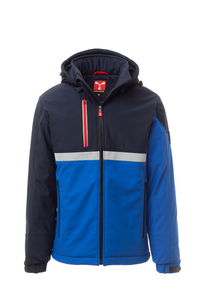 WP 8000 mm H2O, WVT 5000 g/m2 24h. Pánský zateplený softshell, zapínání na zip SBS s kovovým jezdcem „semi-auto lock“ a přizpůsobeným taháčkem. Odnímatelná kapuce se stahovací šňůrkou. Přední reflexní pruh na hrudi. Elastické stahovací manžety na suchý zip a vnitřní manžetka. Dvě boční kapsy na zip a jedna kapsa na hrudi na zip s reflexním prvkem. Prvek „life-saving“ na zadní straně, s vnitřním reflexním logem a zapínáním na zip. Dvě vnitřní kapsy: jedna tvarovaná na zip na pravé straně hrudi a jedna na tablet se zapínáním na suchý zip. Spodní část stažitelná pomocí přizpůsobených zarážek.
