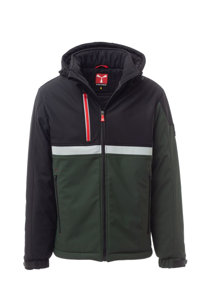 WP 8000 mm H2O, WVT 5000 g/m2 24h. Pánský zateplený softshell, zapínání na zip SBS s kovovým jezdcem „semi-auto lock“ a přizpůsobeným taháčkem. Odnímatelná kapuce se stahovací šňůrkou. Přední reflexní pruh na hrudi. Elastické stahovací manžety na suchý zip a vnitřní manžetka. Dvě boční kapsy na zip a jedna kapsa na hrudi na zip s reflexním prvkem. Prvek „life-saving“ na zadní straně, s vnitřním reflexním logem a zapínáním na zip. Dvě vnitřní kapsy: jedna tvarovaná na zip na pravé straně hrudi a jedna na tablet se zapínáním na suchý zip. Spodní část stažitelná pomocí přizpůsobených zarážek.