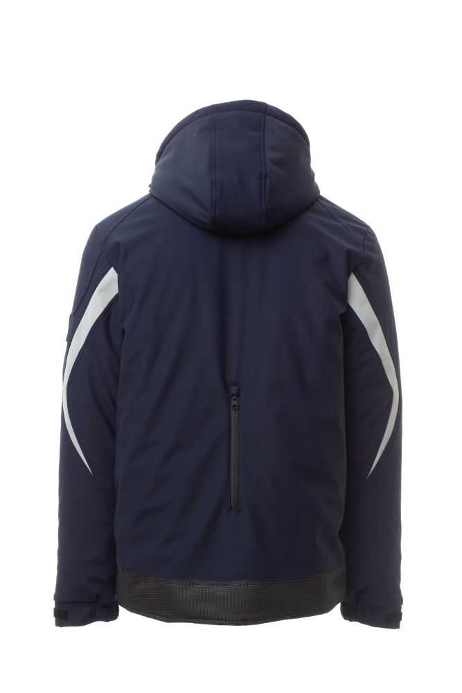 WP 8000 mm H2O, WVT 5000 g/m2 24h. Pánský zateplený softshell, zapínání na zip SBS s kovovým jezdcem „semi-auto lock“ a přizpůsobeným taháčkem. Odnímatelná kapuce se stahovací šňůrkou. Reflexní pruh na ramenou a pažích. Elastické stahovací manžety na suchý zip a s vnitřní manžetou. Kapsa na hrudi Lock System s klopou a očkem na pero. Dvě boční kapsy s voděodolným zipem. Prvek „life-saving“ na zadní straně, s vnitřním reflexním logem a voděodolným zipem. Dvě vnitřní kapsy, z nichž jedna na tablet se zapínáním na suchý zip a druhá tvarovaná na zip na pravé straně hrudi. Spodní část stažitelná pomocí přizpůsobených zarážek. Tečkovaná tkanina s reflexním efektem.