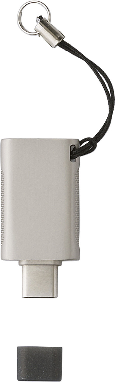Otočný USB flash disk vyrobený ze zinkové slitiny s matným grafitovým povrchem a šňůrkou. Kapacita 64 GB, s otočnou funkcí pro USB-A a USB-C. Baleno v sáčku a krabičce. Rozměry: 3,6 × 1,9 × 0,6 cm. Cena nezahrnuje recyklační poplatek a autorskou odměnu.